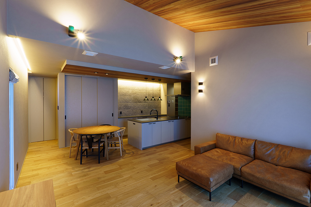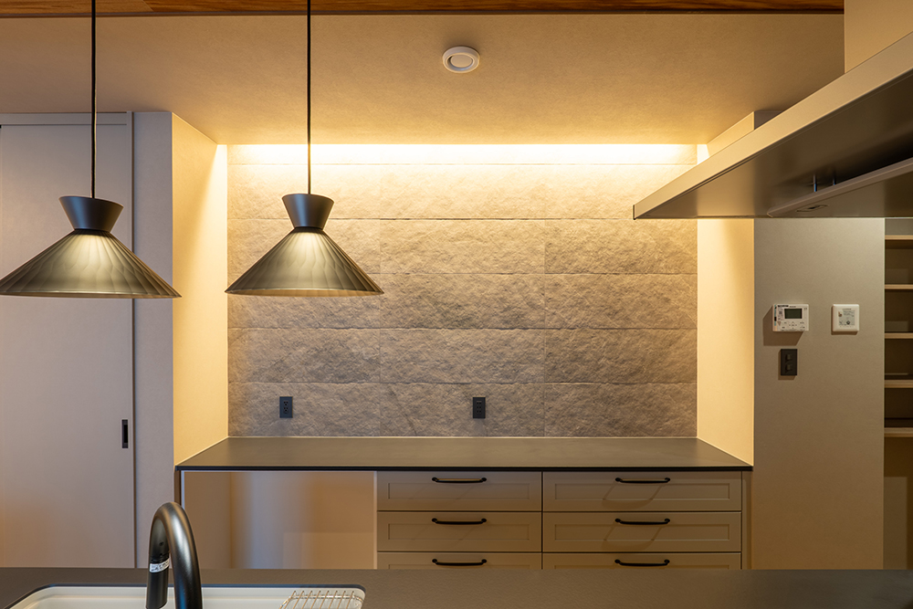 視線の先となる壁を建築家照明で明るく照らし、ほどよく天井にもあかりを向けることで、落ち着き感が増します!