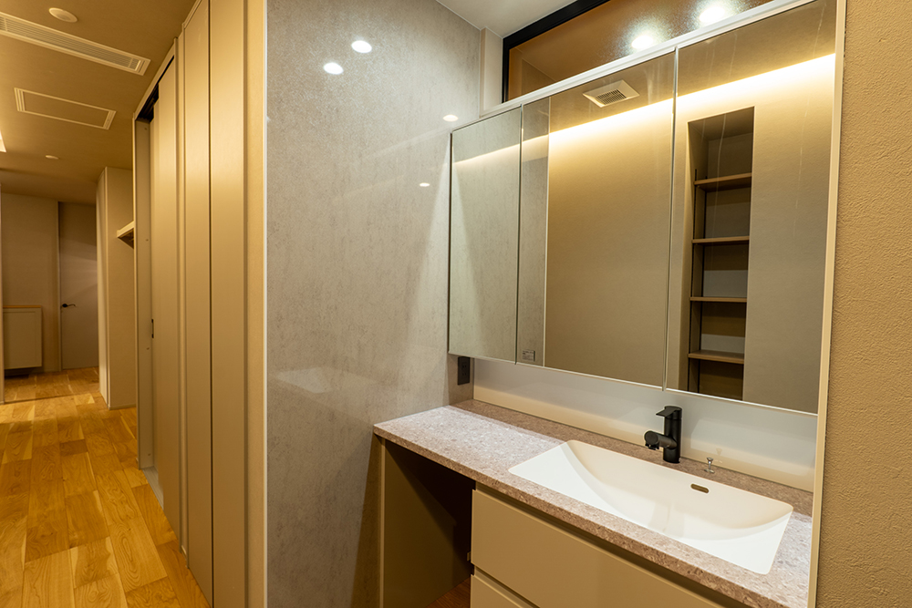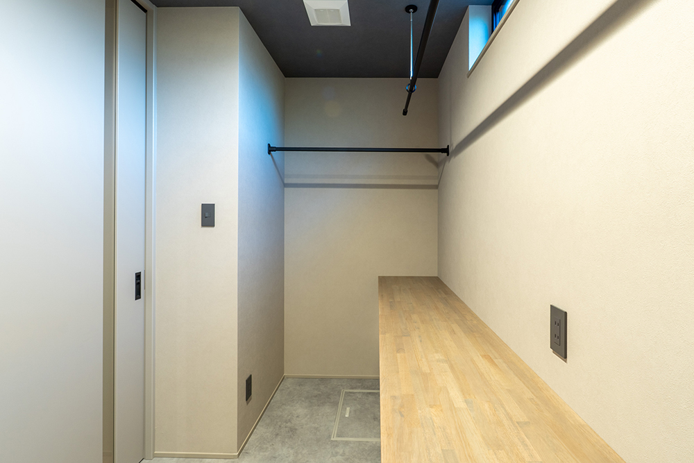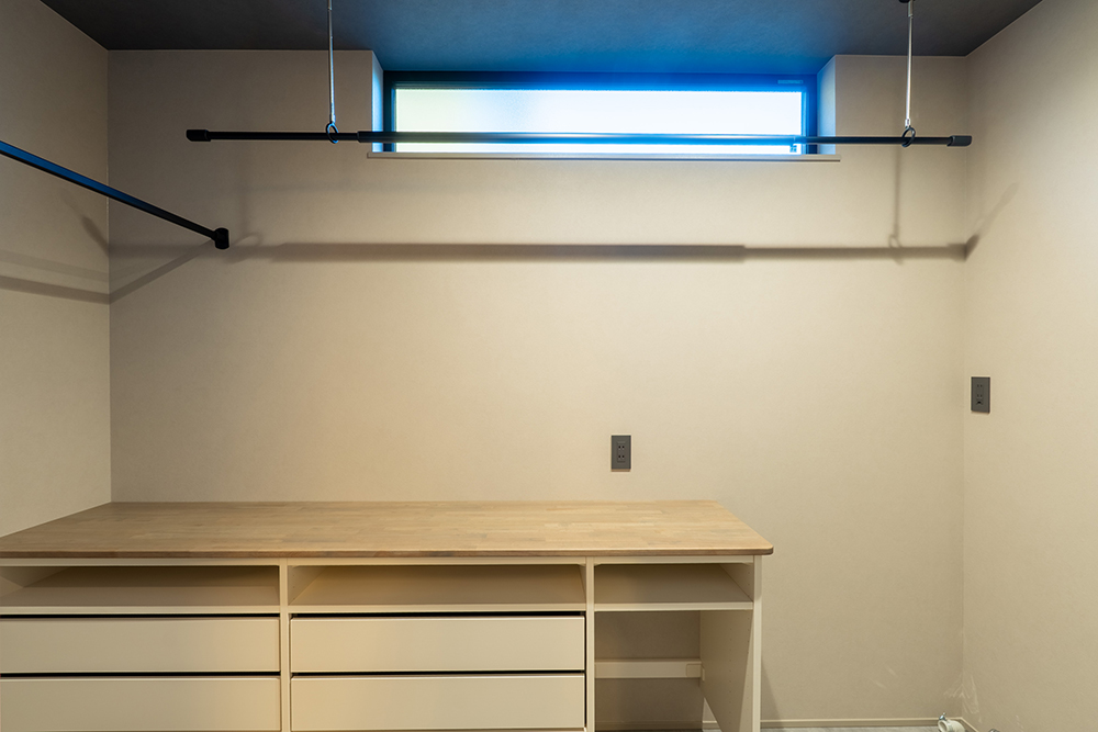 アイロンなどで使えるカウンターと引き出し収納もついた棚は、ご家族分の下着やパジャマなどを仕舞えるようになっています。