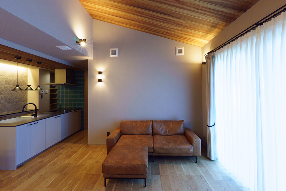 大開口の窓と、吹抜勾配天井を採用し、空間に広がりを見せる工夫をしています!